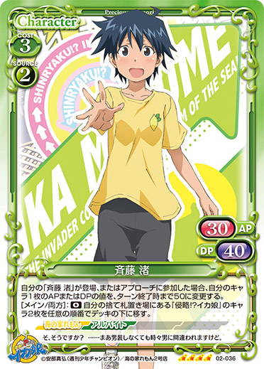 | 自分の「斉藤 渚」が登場、またはアプローチに参加した場合、自分のキャラ1枚のAPまたはDPの値を、ターン終了時まで50に変更する。[メイン/両方]:《0》自分の捨て札置き場にある『侵略!?イカ娘』のキャラ2枚を任意の順番でデッキの下に移す。 | ||