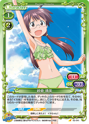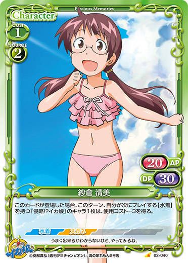 | このカードが登場した場合、このターン、自分が次にプレイする【水着】を持つ『侵略!?イカ娘』のキャラ1枚は、使用コスト-3を得る。 | ||