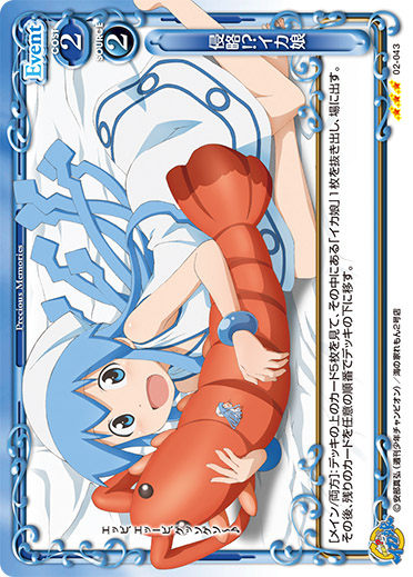 | このカードが登場した場合、デッキの上のカード5枚を見て、その中にある「イカ娘」1枚を抜き出し、表にしてから手札に加える。その後、残りのカードを任意の順番でデッキの下に移す。 | ||