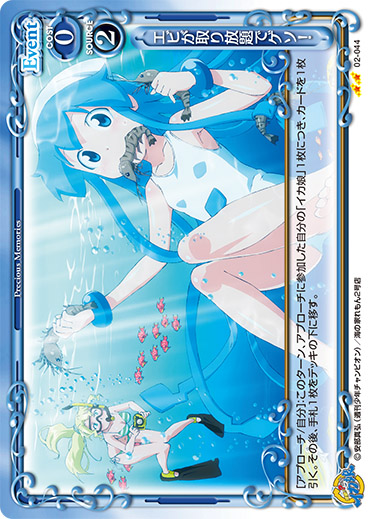 | [アプローチ/自分]:このターン、アプローチに参加した自分の「イカ娘」1枚につき、カードを1枚引く。その後、手札1枚をデッキの下に移す。 | ||