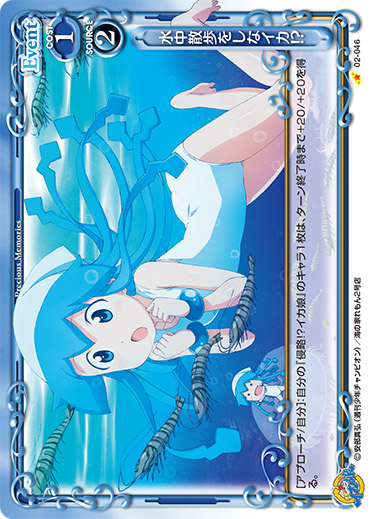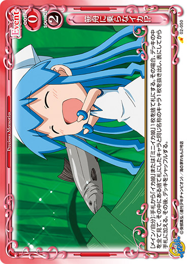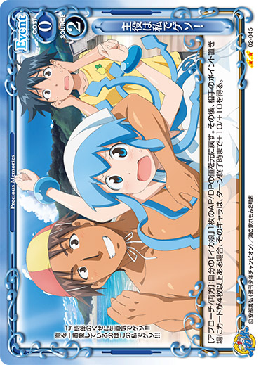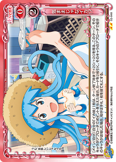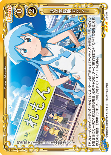 | [メイン/自分]:自分の「イカ娘」1枚は、ターン終了時まで+20/+20を得る。このターン、そのキャラがアプローチでポイントを与えた場合、カードを2枚引く。そのキャラのアプローチで相手のキャラが退場した場合、相手は手札1枚を捨て札にする。 | ||