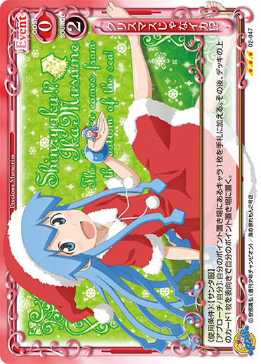 | 《使用条件》:【サンタ服】[アプローチ/自分]:自分のポイント置き場にあるキャラ1枚を手札に加える。その後、デッキの上のカード1枚を表向きで自分のポイント置き場に置く。 | ||