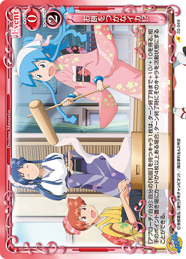 | [アプローチ/自分]:自分の【和服】を持つキャラ1枚は、ターン終了時まで+10/+10を得る。相手のポイント置き場にカードが4枚以上ある場合、ターン終了時にそのキャラを活動状態にすることができる。 | ||