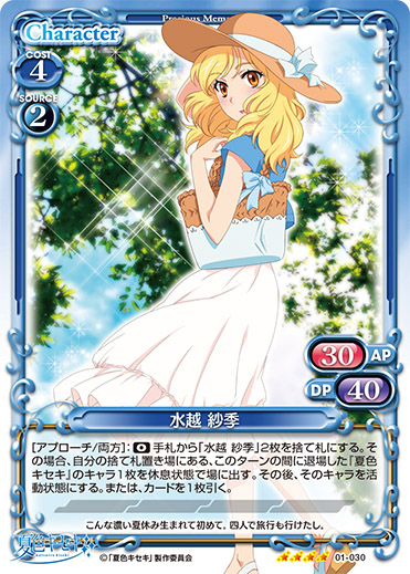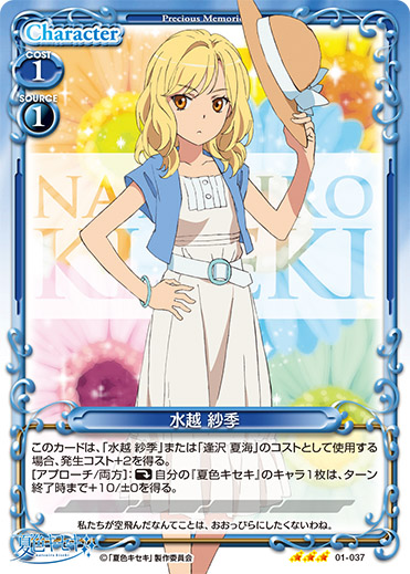 | [アプローチ/両方]:《0》手札から「水越 紗季」2枚を捨て札にする。その場合、自分の捨て札置き場にある、このターンの間に退場した『夏色キセキ』のキャラ1枚を休息状態で場に出す。その後、そのキャラを活動状態にする。または、カードを1枚引く。 | ||