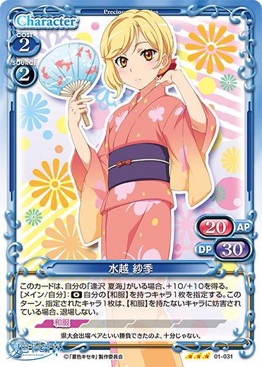 | このカードは、自分の「逢沢 夏海」がいる場合、+10/+10を得る。[メイン/自分]:《0》自分の【和服】を持つキャラ1枚を指定する。このターン、指定されたキャラ1枚は、【和服】を持たないキャラに妨害されている場合、退場しない。 | ||