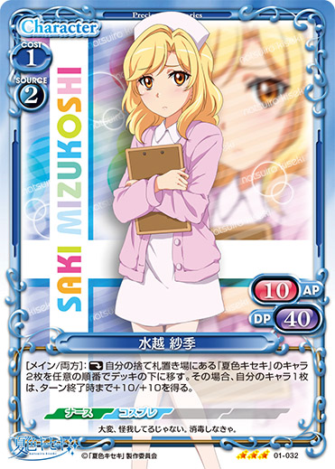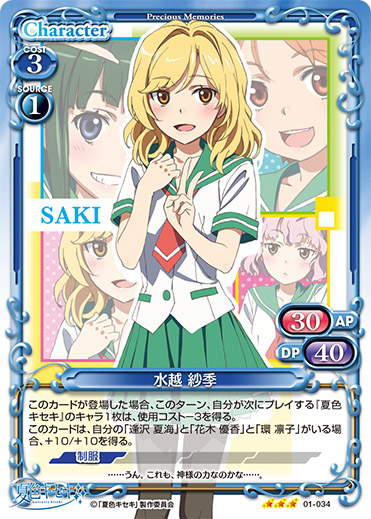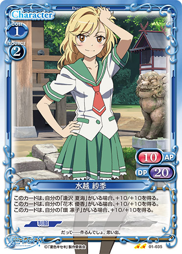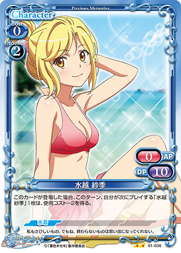 | このカードが登場した場合、このターン、自分が次にプレイする「水越 紗季」1枚は、使用コスト-2を得る。 | ||