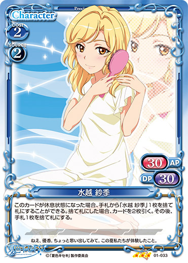 | このカードが休息状態になった場合、手札から「水越 紗季」1枚を捨て札にすることができる。捨て札にした場合、カードを2枚引く。その後、手札1枚を捨て札にする。 | ||