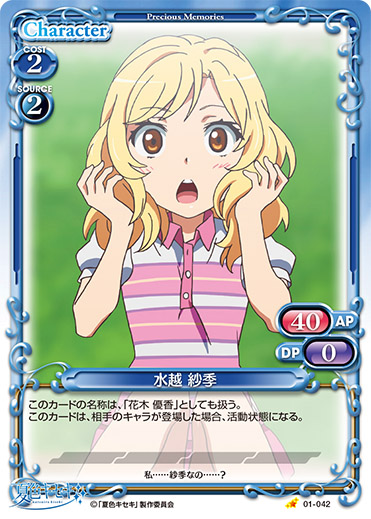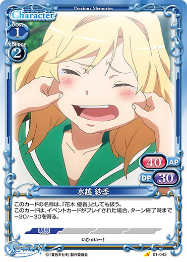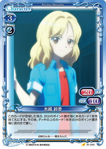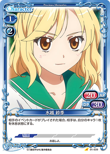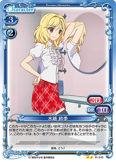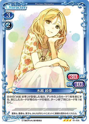 | 自分の「水越 紗季」が登場した場合、デッキの上のカード1枚を表にする。表にしたカードが青のカードの場合、ターン終了時にカードを1枚引く。 | ||