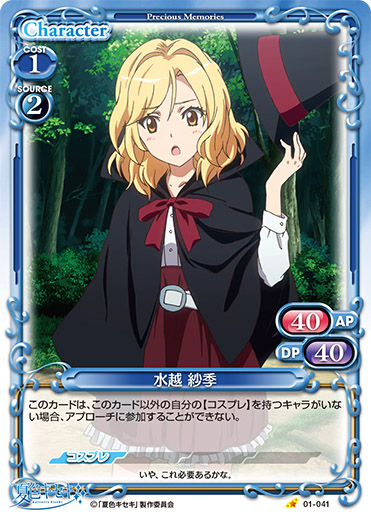 | このカードは、このカード以外の自分の【コスプレ】を持つキャラがいない場合、アプローチに参加することができない。 | ||