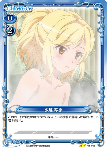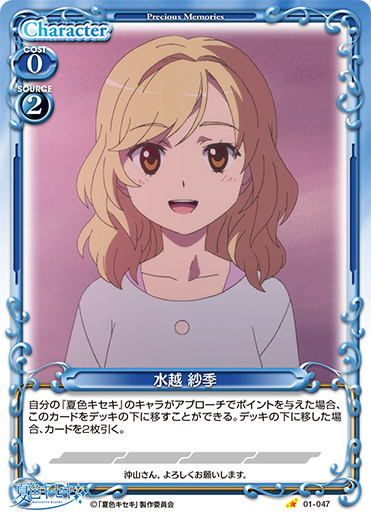 | 自分の『夏色キセキ』のキャラがアプローチでポイントを与えた場合、このカードをデッキの下に移すことができる。デッキの下に移した場合、カードを2枚引く。 | ||