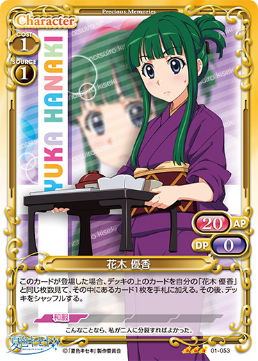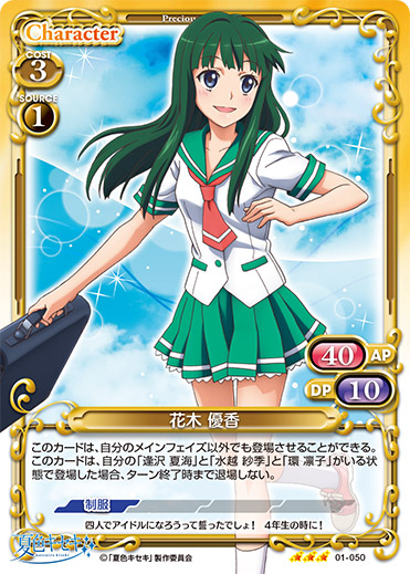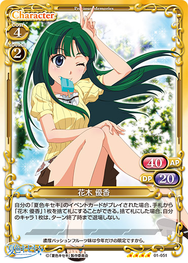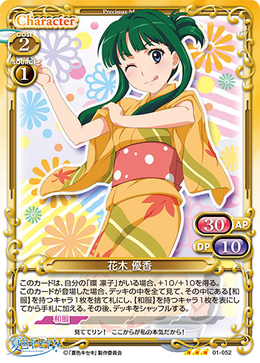 | 自分の『夏色キセキ』のイベントカードがプレイされた場合、手札から「花木 優香」1枚を捨て札にすることができる。捨て札にした場合、自分のキャラ1枚は、ターン終了時まで退場しない。 | ||