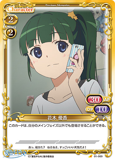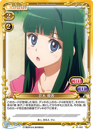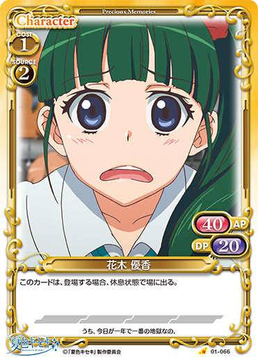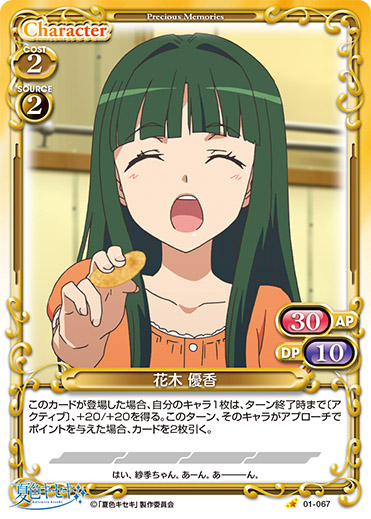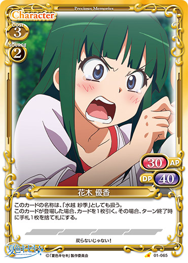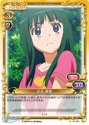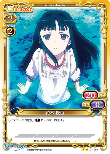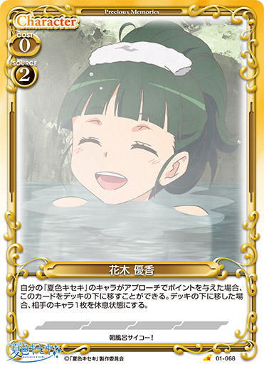 | 自分の『夏色キセキ』のキャラがアプローチでポイントを与えた場合、このカードをデッキの下に移すことができる。デッキの下に移した場合、相手のキャラ1枚を休息状態にする。 | ||