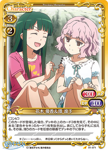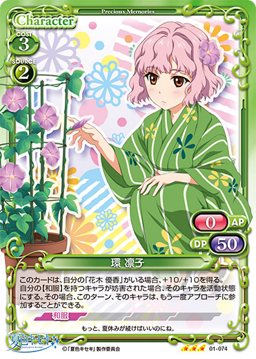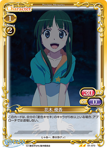 | このカードは、自分の「花木 優香」がいる場合、+10/+10を得る。自分の【和服】を持つキャラが妨害された場合、そのキャラを活動状態にする。その場合、このターン、そのキャラは、もう一度アプローチに参加することができる。 | ||