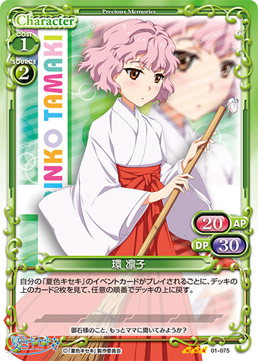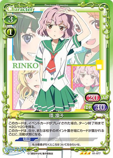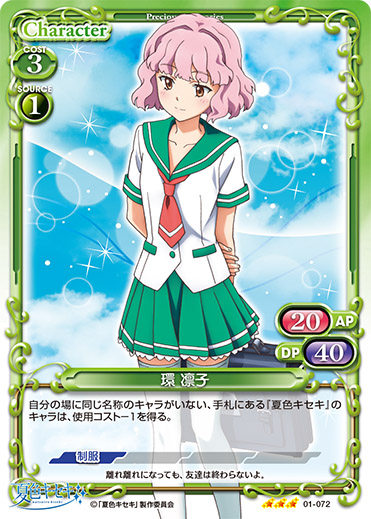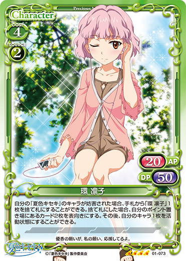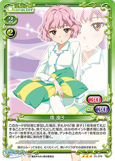 | 自分の『夏色キセキ』のキャラが妨害された場合、手札から「環 凛子」1枚を捨て札にすることができる。捨て札にした場合、自分のポイント置き場にあるカード2枚を表向きにする。その後、自分のキャラ1枚を活動状態にすることができる。 | ||