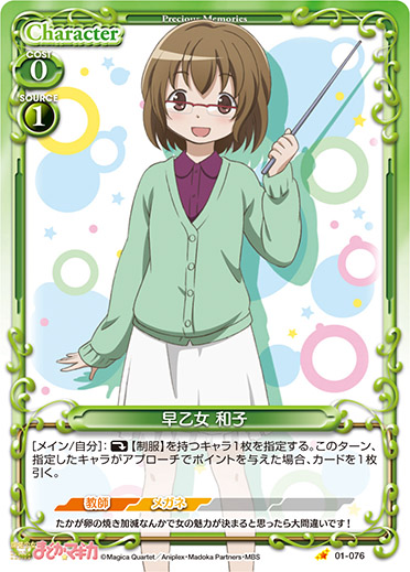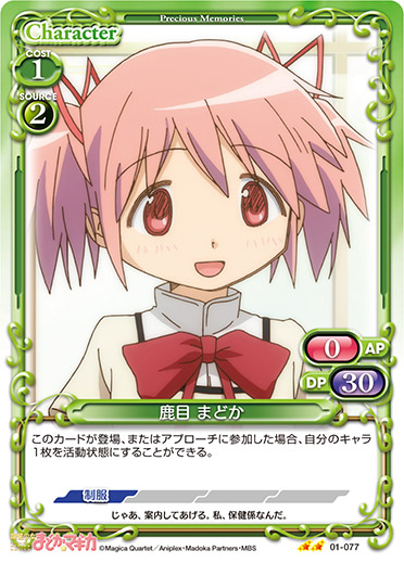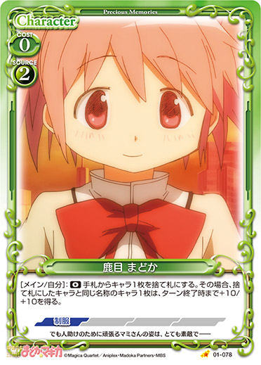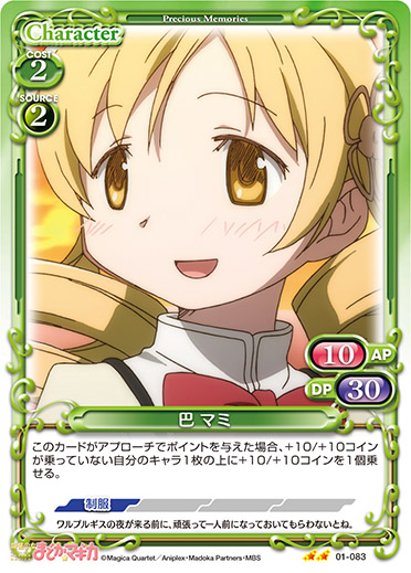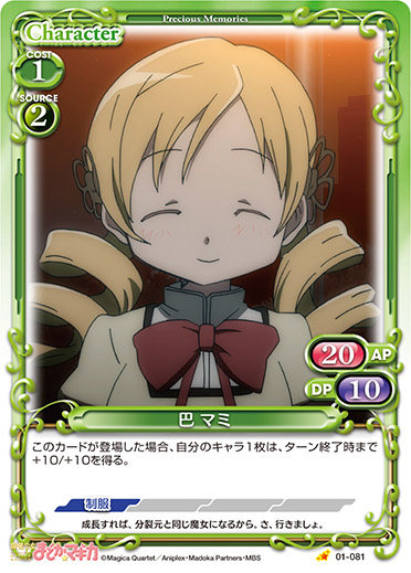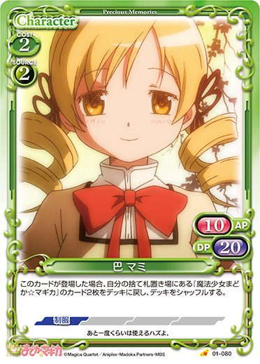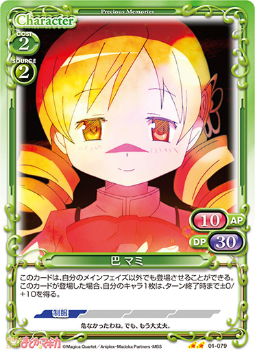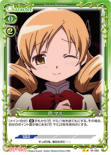 | [メイン/自分]:《0》手札から「巴 マミ」1枚を捨て札にする。その場合、自分のポイント置き場にある「巴 マミ」2枚を表向きにする。 | ||