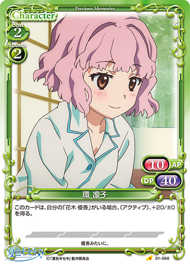 | このカードは、自分の「花木 優香」がいる場合、〔アクティブ〕、+20/±0を得る。 | ||