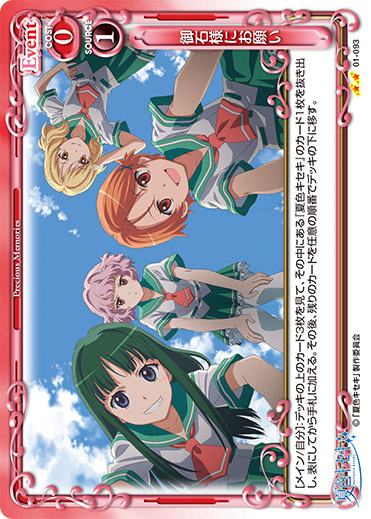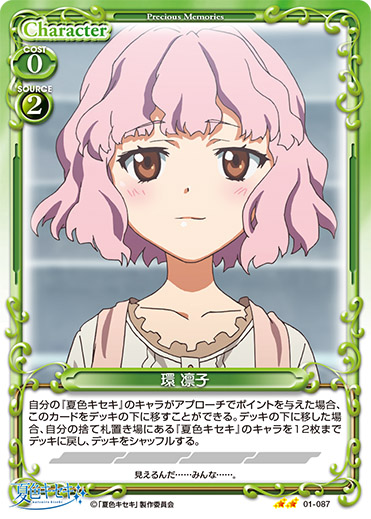 | 自分の『夏色キセキ』のキャラがアプローチでポイントを与えた場合、このカードをデッキの下に移すことができる。デッキの下に移した場合、自分の捨て札置き場にある『夏色キセキ』のキャラを12枚までデッキに戻し、デッキをシャッフルする。 | ||