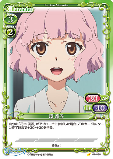 | 自分の「花木 優香」がアプローチに参加した場合、このカードは、ターン終了時まで+30/+30を得る。 | ||