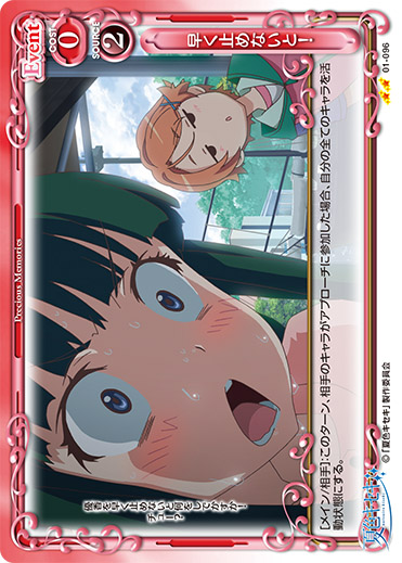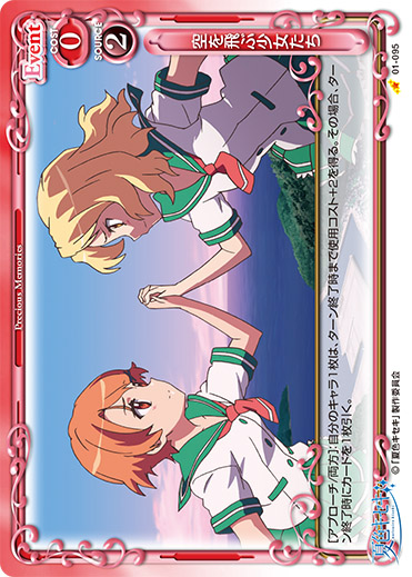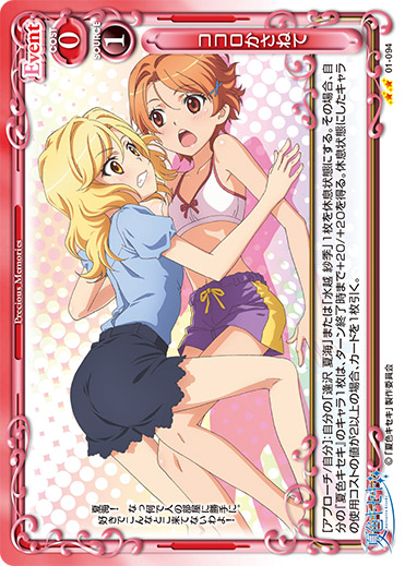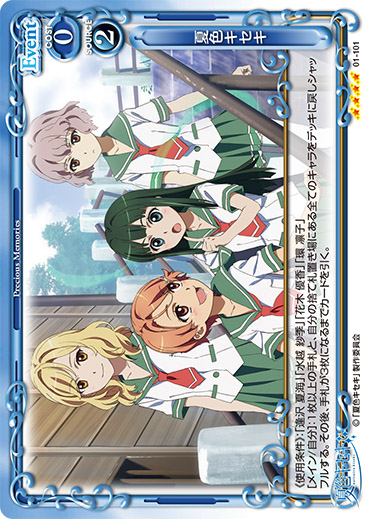 | [アプローチ/自分]:自分の「逢沢 夏海」または「水越 紗季」1枚を休息状態にする。その場合、自分の『夏色キセキ』のキャラ1枚は、ターン終了時まで+20/+20を得る。休息状態にしたキャラの使用コストの値が2以上の場合、カードを1枚引く。 | ||