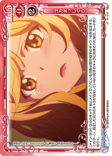 | [メイン/自分]:自分のキャラ1枚とメインエリアにいる活動状態の相手のキャラ1枚を指定する。このターン、指定した自分のキャラが指定していない相手のキャラに妨害された場合、カードを2枚引く。 | ||