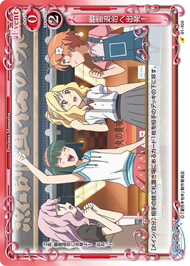 | 《使用条件》:「逢沢 夏海」「水越 紗季」「花木 優香」「環 凛子」[メイン/自分]:1枚以上の手札と、自分の捨て札置き場にある全てのキャラをデッキに戻しシャッフルする。その後、手札が3枚になるまでカードを引く。 | ||