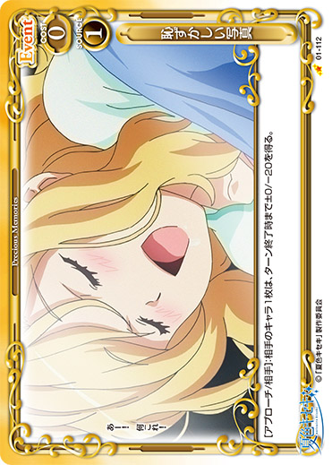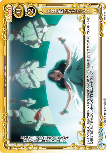 | [メイン/自分]:相手のキャラ1枚を指定する。このターン、相手は、指定されたキャラのテキストを使用することができない。ターン終了時にカードを1枚引く。 | ||