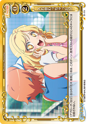 | [アプローチ/自分]:自分の「花木 優香」1枚は、このターン、使用コストの値が2と4のキャラには妨害されない。 | ||