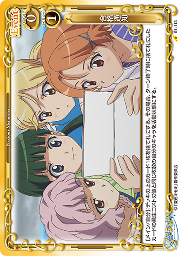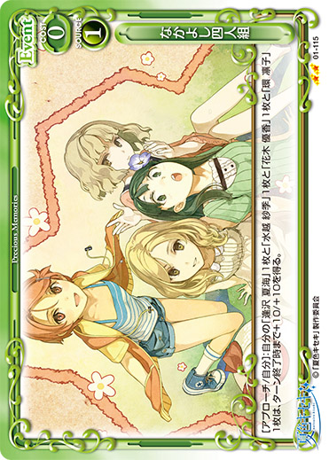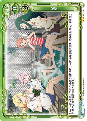 | [アプローチ/自分]:自分の「逢沢 夏海」1枚と「水越 紗季」1枚と「花木 優香」1枚と「環 凛子」1枚は、ターン終了時まで+10/+10を得る。 | ||