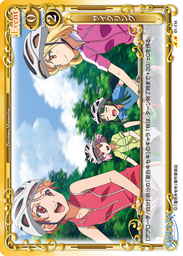| [アプローチ/自分]:自分の『夏色キセキ』のキャラ1枚は、ターン終了時まで+20/±0を得る。 | ||