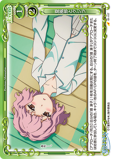 | [メイン/自分]:デッキの上のカード1枚を捨て札にする。その場合、ターン終了時に捨て札にしたカードの発生コストの値と同じ枚数の自分のキャラを活動状態にする。 | ||