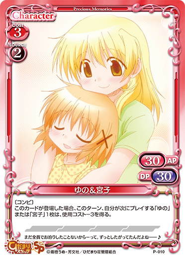 | 〔コンビ〕 このカードが登場した場合、このターン、自分が次にプレイする「ゆの」または「宮子」1枚は、使用コスト-3を得る。 | ||