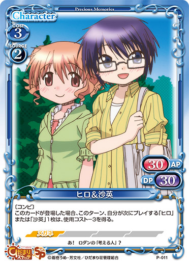 | 〔コンビ〕 このカードが登場した場合、このターン、自分が次にプレイする「ヒロ」または「沙英」1枚は、使用コスト-3を得る。 | ||