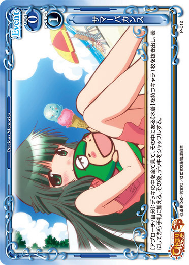 | [アプローチ/自分]:デッキの中をすべて見て、その中にある【水着】を持つキャラ1枚を抜き出し、表にしてから手札に加える。その後、デッキをシャッフルする。 | ||