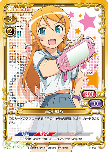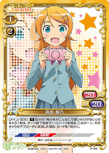 | [メイン/自分]:《1》自分の『俺の妹がこんなに可愛いわけがない』のキャラ1枚は、ターン終了時まで+10/+10を得る。このターン、そのキャラがアプローチに参加した場合、カードを1枚引く。 | ||