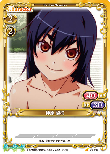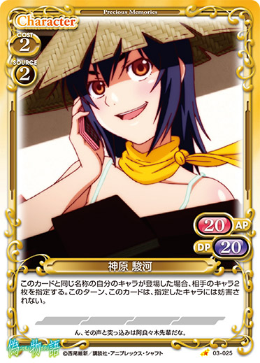 | このカードが登場した場合、このターン、自分が次にプレイする「阿良々木 火憐」1枚は、使用コスト-2を得る。 | ||