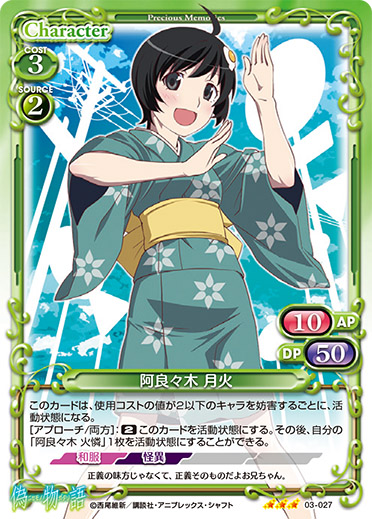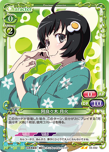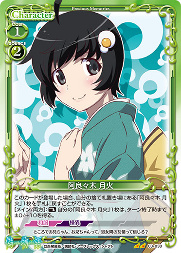 | このカードが登場した場合、自分の捨て札置き場にある「阿良々木 月火」1枚を手札に戻すことができる。[メイン/両方]:《休》自分の「阿良々木 月火」1枚は、ターン終了時まで±0/+10を得る。 | ||