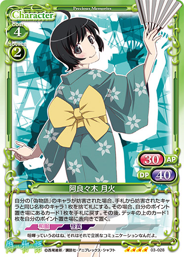 | 自分の『偽物語』のキャラが妨害された場合、手札から妨害されたキャラと同じ名称のキャラ1枚を捨て札にする。その場合、自分のポイント置き場にあるカード1枚を手札に戻す。その後、デッキの上のカード1枚を自分のポイント置き場に表向きで置く。 | ||