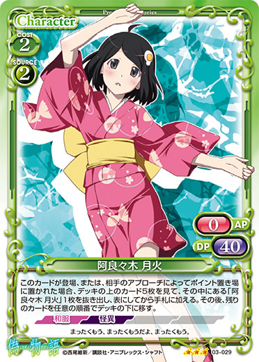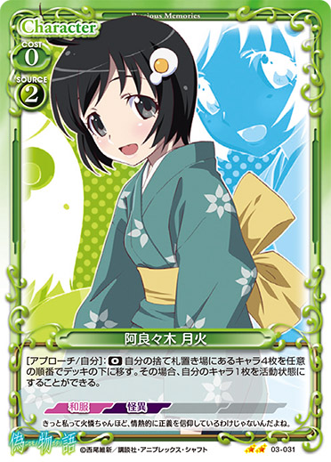 | このカードが登場、または、相手のアプローチによってポイント置き場に置かれた場合、デッキの上のカード5枚を見て、その中にある「阿良々木 月火」1枚を抜き出し、表にしてから手札に加える。その後、残りのカードを任意の順番でデッキの下に移す。 | ||