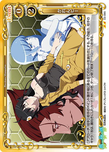 | [アプローチ/相手]:相手のポイント置き場にある全てのカードを裏向きにする。その場合、相手のキャラ1枚は、裏向きにしたカード1枚につき、ターン終了時まで-10/-10を得る。 | ||
