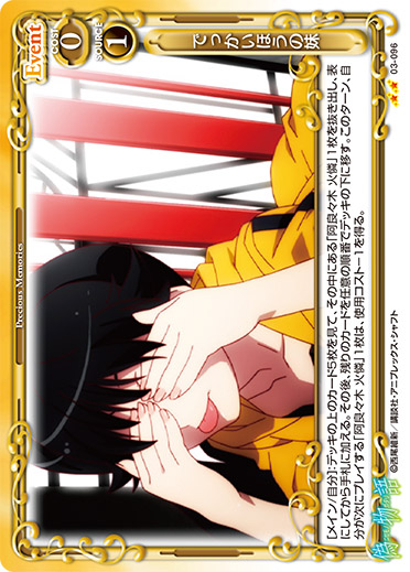 | 自分の「千石 撫子」が妨害された場合、手札から「千石 撫子」1枚をサポートエリアに出すことができる。[メイン/自分]:《休》自分の「千石 撫子」1枚は、ターン終了時に活動状態になる。 | ||