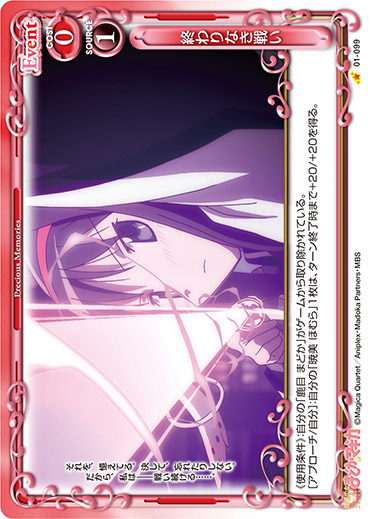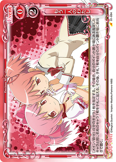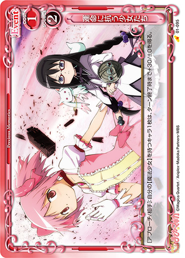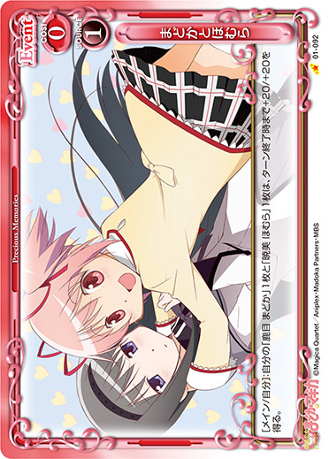 | [メイン/自分]:自分の「鹿目 まどか」1枚と「暁美 ほむら」1枚は、ターン終了時まで+20/+20を得る。 | ||