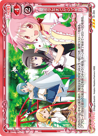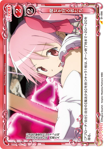 | [アプローチ/自分]:自分の【魔法少女】を持つキャラ1枚は、ターン終了時まで+20/+20を得る。 | ||