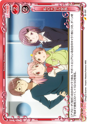 | [アプローチ/相手]:自分の【魔法少女】を持つキャラ1枚は、ターン終了時まで+30/±0を得る。 | ||
