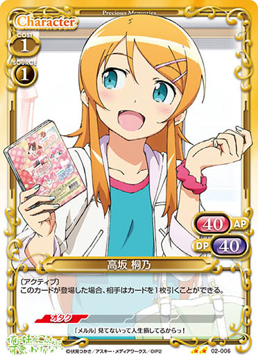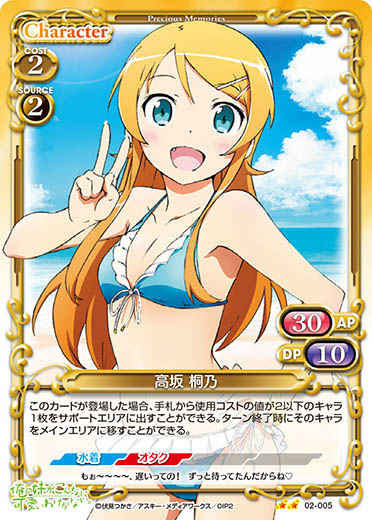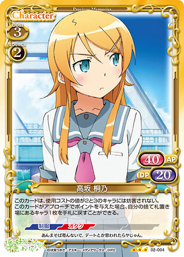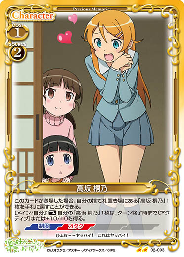 | このカードが登場した場合、自分の捨て札置き場にある「高坂 桐乃」1枚を手札に戻すことができる。[メイン/自分]:《休》自分の「高坂 桐乃」1枚は、ターン終了時まで〔アクティブ〕または+10/±0を得る。 | ||