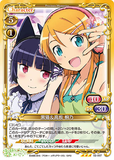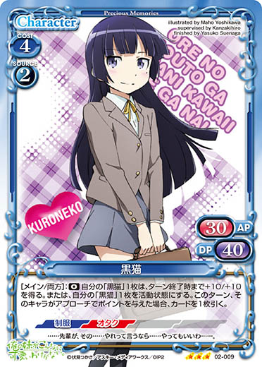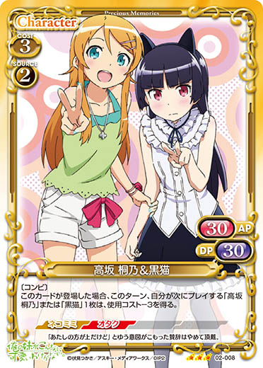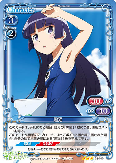 | 〔コンビ〕このカードが登場した場合、このターン、自分が次にプレイする「高坂 桐乃」または「黒猫」1枚は、使用コスト-3を得る。 | ||