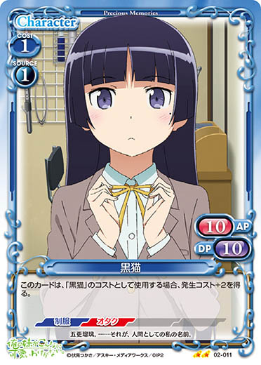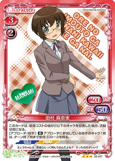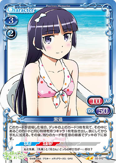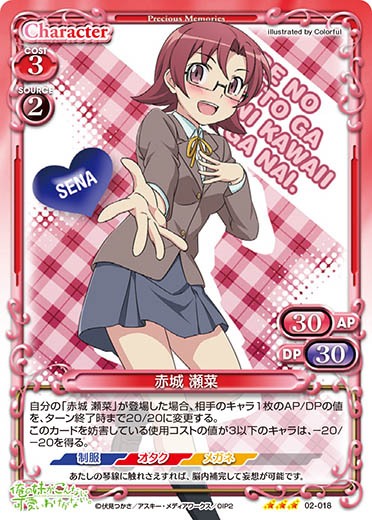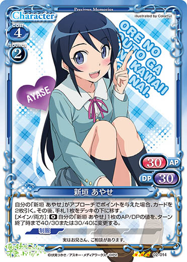 | 自分の「新垣 あやせ」がアプローチでポイントを与えた場合、カードを2枚引く。その後、手札1枚をデッキの下に移す。 [メイン/両方]:《0》自分の「新垣 あやせ」1枚のAP/DPの値を、ターン終了時まで40/30または30/40に変更する。 | ||