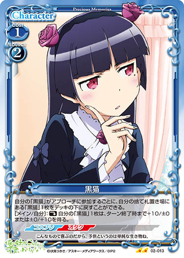 | 自分の「黒猫」がアプローチに参加するごとに、自分の捨て札置き場にある「黒猫」1枚をデッキの下に戻すことができる。 [メイン/自分]:《休》自分の「黒猫」1枚は、ターン終了時まで+10/±0または±0/+10を得る。 | ||