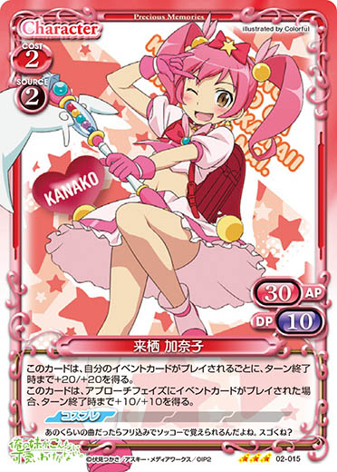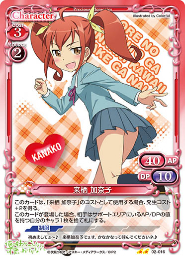 | このカードは、「来栖 加奈子」のコストとして使用する場合、発生コスト+2を得る。 このカードが登場した場合、相手はサポートエリアにいるAP/DPの値を持つ自分のキャラ1枚を捨て札にする。 | ||