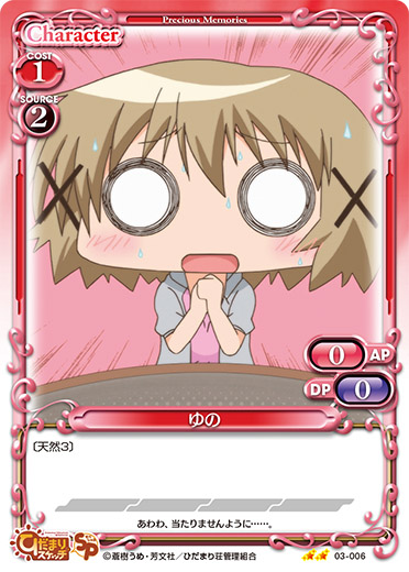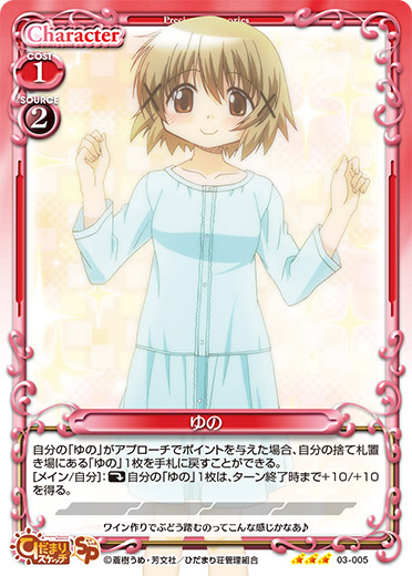 | 自分の「ゆの」がアプローチでポイントを与えた場合、自分の捨て札置き場にある「ゆの」1枚を手札に戻すことができる。 [メイン/自分]:《休》自分の「ゆの」1枚は、ターン終了時まで+10/+10を得る。 | ||