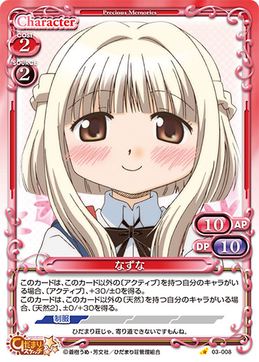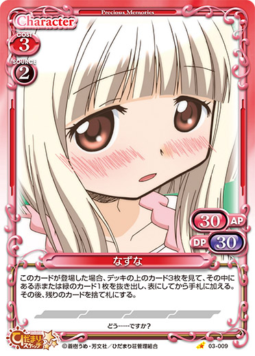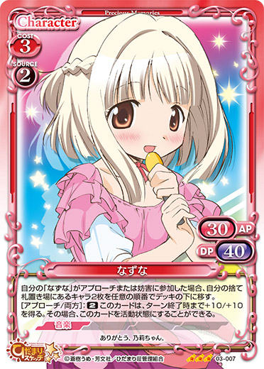 | 自分の「なずな」がアプローチまたは妨害に参加した場合、自分の捨て札置き場にあるキャラ2枚を任意の順番でデッキの下に移す。 [アプローチ/両方]:《2》このカードは、ターン終了時まで+10/+10を得る。その場合、このカードを活動状態にすることができる。 | ||